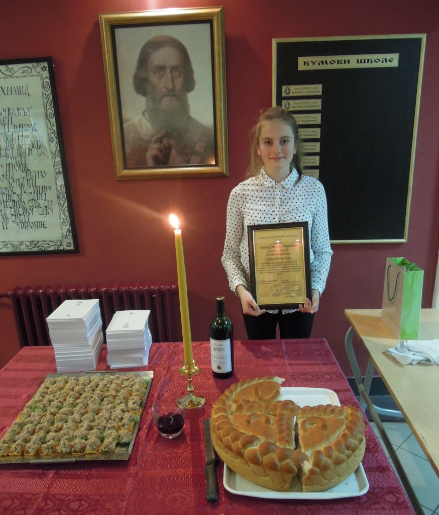 Након Химне Светом Сави и обреда резања славског колача, уручена је повеља и награда овогодишњем Светосавском детету – Теодори Танасић.