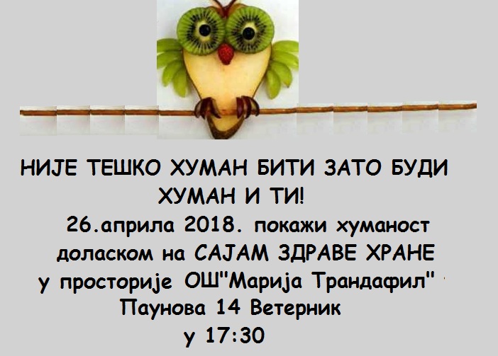 Позивамо све заинтересоване ученике, родитеље, наставнике, њихове пријатеље, рођаке, као и све хумане особе да се одазову на Хуманитарни сајам здраве хране, који ће се одржати у четвртак, 26. априла 2018. године у просторијама ОШ “Марија Трандафил” у Ветернику у 17:30.