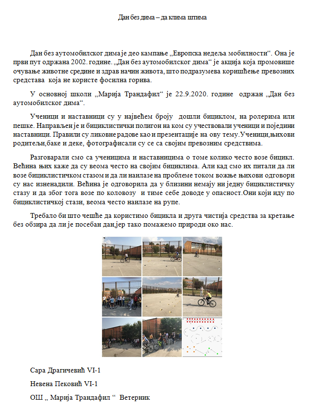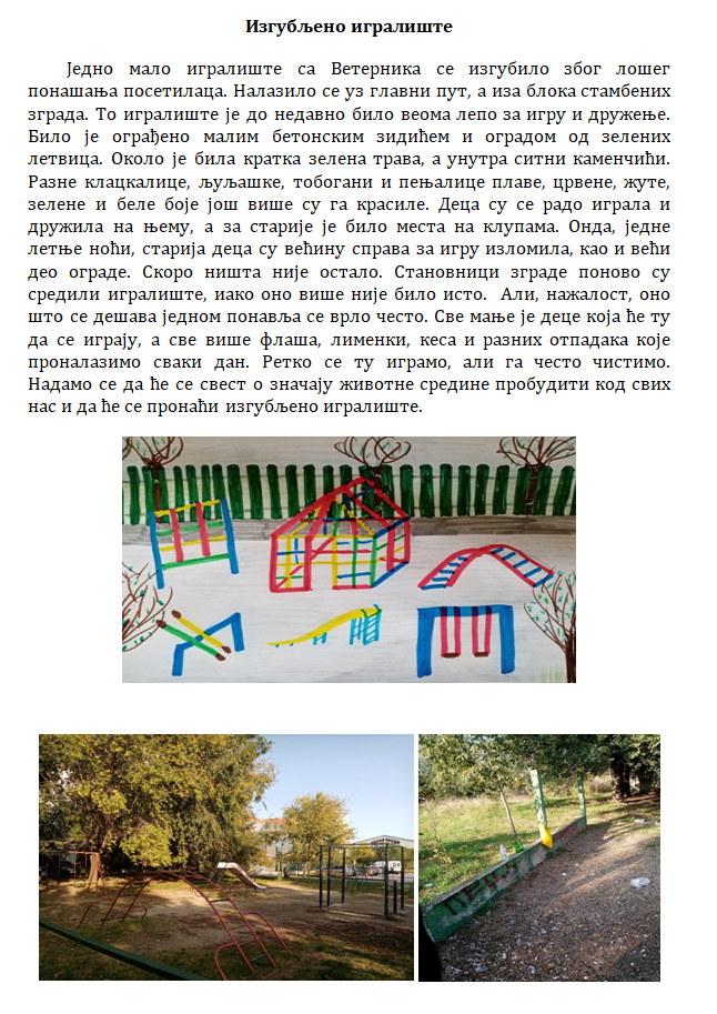 На шестом по реду конкурсу „Школски зелени прес“, који организује еколошко удружење „Зелено питање“ и дечји еколошки часопис „Чувари равнице“, уз подршку Министарства културе и информисања, награђена су чак два рада ученика наше школе. На конкурсу су учествовале 93 школе са преко 300 ученичких радова, а међу најбољима нашли су се еколошки чланци „Изгубљено игралиште“ Јоване и Немање Радмановића (4-3, ментор Олинка Мацановић) и „Дан без дима – да клима штима“ Саре Драгичевић и Невене Пековић (6-1, ментор Наташа Крушчић).