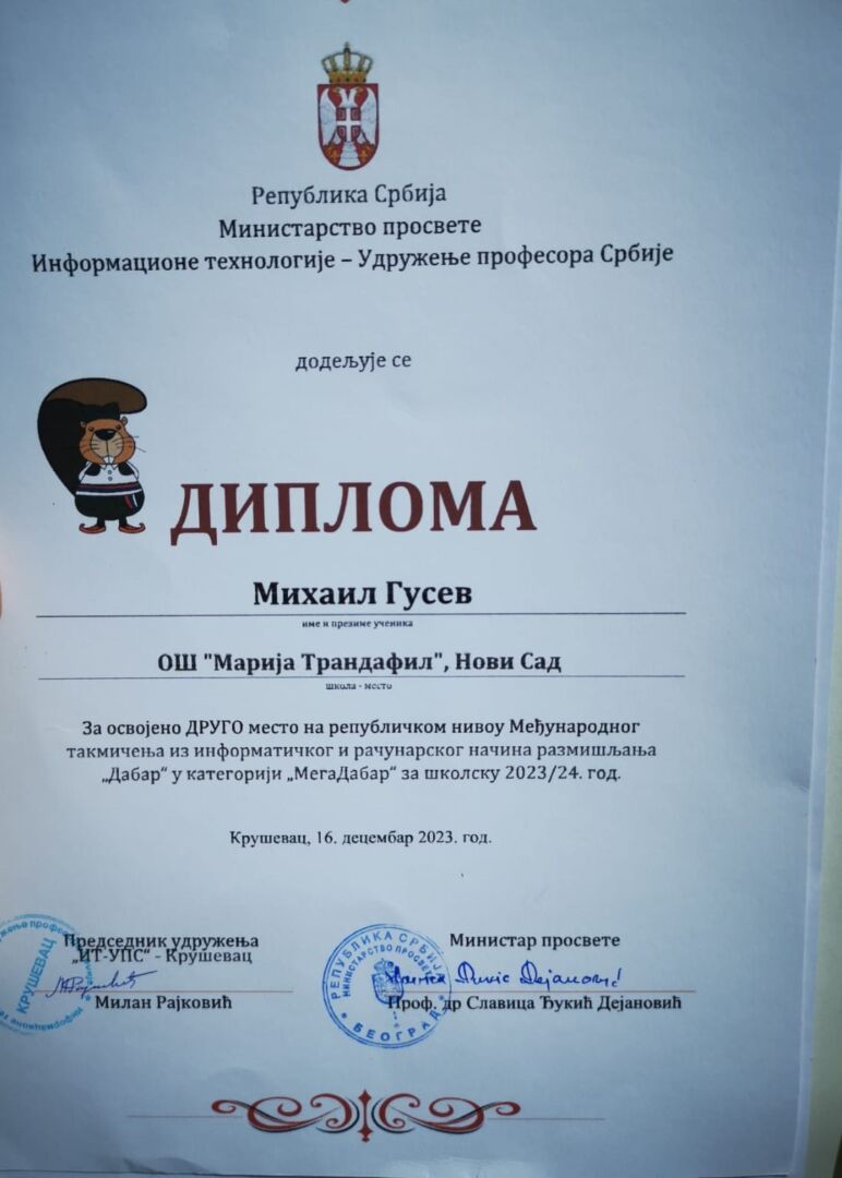 Михаил Гусев ученик 8-2 освојио је 2. место на републичком такмичењу Дабар у Крушевцу.