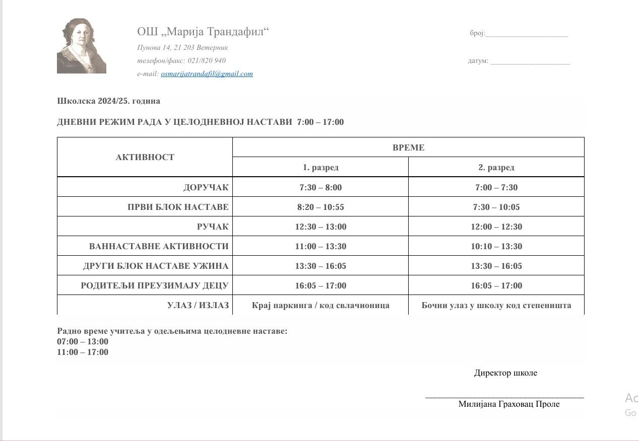 📌Одељења целодневне наставе (1-1, 1-2, 2-1) школу похађају од 7:00 до 17:00