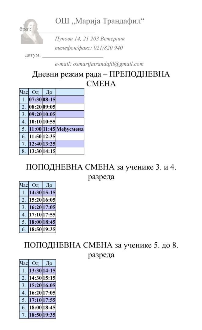 📌Ученици 1. и 2. разреда (одељења 2-2, 2-3) током читаве школске године иду у преподневну смену (7:30-10:55)
